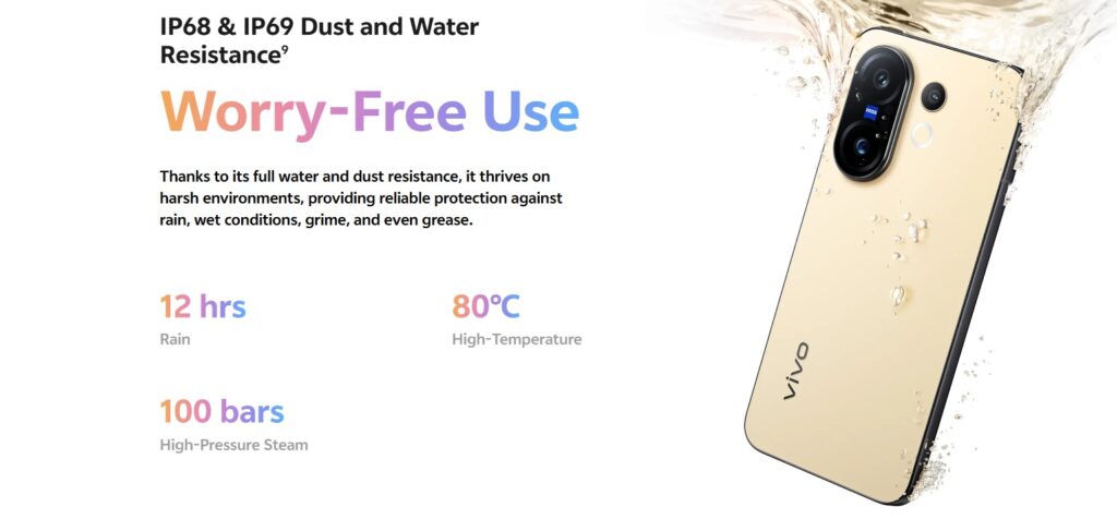 हर मौसम में साथ निभाए फोन पूरी तरह पानी और धूल से सुरक्षित 80°C तक की गर्मी और 100 बार प्रेशर भी झेल सकता है,चाहे बारिश हो या स्टीम – X200 FE को कोई फर्क नहीं पड़ता |