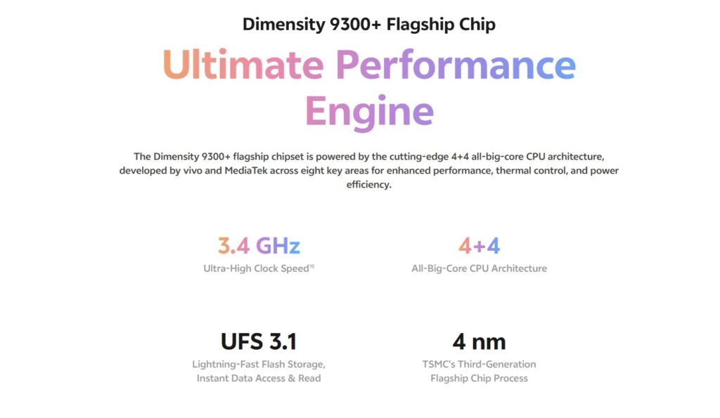 पावर का नया नाम 3.4GHz हाई परफॉर्मेंस प्रोसेसर 4+4 ऑल बिग कोर CPU आर्किटेक्चर 4nm TSMC चिप टेक्नोलॉजी UFS 3.1 स्टोरेज गेमिंग हो या मल्टीटास्किंग – सब कुछ होता है लाइटनिंग फास्ट।